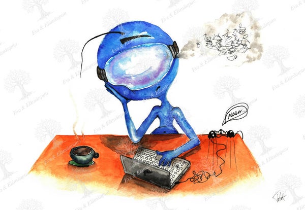 Kuvituksien sarja Blue Aliens. Oikein maalauksen vesiväreillä (Tarkka toistaminen on mahdotonta)