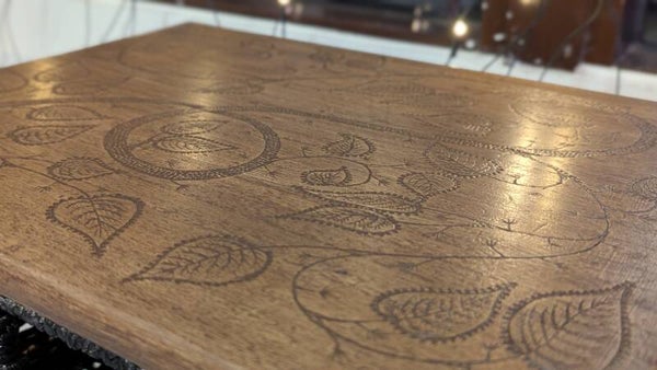 Mukava, kahvinruskea korilipasto, jonka pintaan on polttamalla tehty luonnon inspiroima kuvio. Selkeä ja yksinkertainen, mutta silti erikoinen.